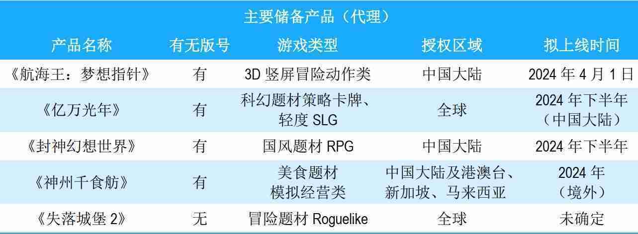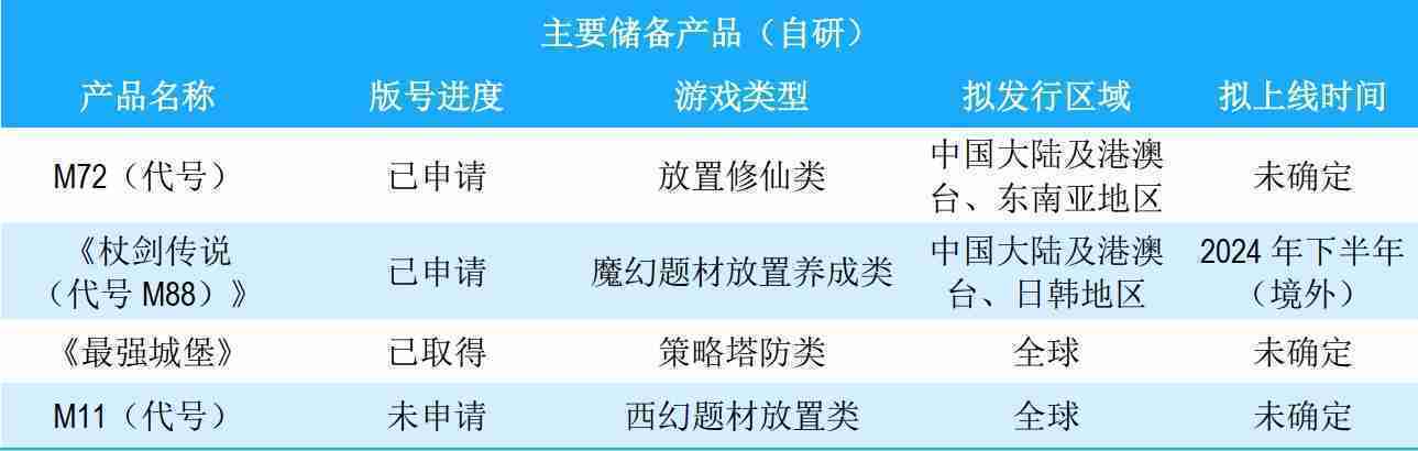 公司储备的多个自研、、代理产品都在有序推进当中,,,涵盖放置类、、、策略类、、、、模拟经营类、、、、RPG、、Roguelike等多元化游戏品类,,储备的主要自研和代理产品如下:::